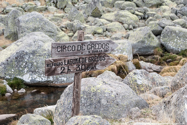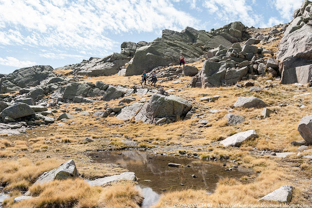 Pasamos por este "hitón". Por lo que se ve, todo el que pasa añade una piedra. Desde este punto, por la espalda de mis compis, se ve el camino que hemos traído, más o menos. Es llamada la Garganta de Prado Puerto. Al parecer dicha zona se llena de flores en primavera.
